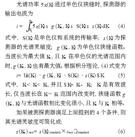 確定校準燈光譜分布時, 需考慮輻射源的光譜范圍。若將兩個儀器的光譜直接比較, 則不必考慮光譜選擇儀器的光譜傳輸率。確定被測燈的光譜分布方法與用已知標準探測器的光譜響應率確定另一未知探測器的光譜響應率相同。